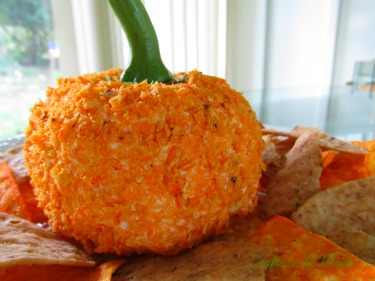 I saw a this darling pumpkin cheeseball over at Family Fresh Meals and decided I really had to make this for a family gathering (it was a BIG HIT - how did you do that?). This is a variation on a cheeseball that I have been making for years with softened cream cheese and shredded cheddar cheese. The orange color? It comes from crushed up Doritos.